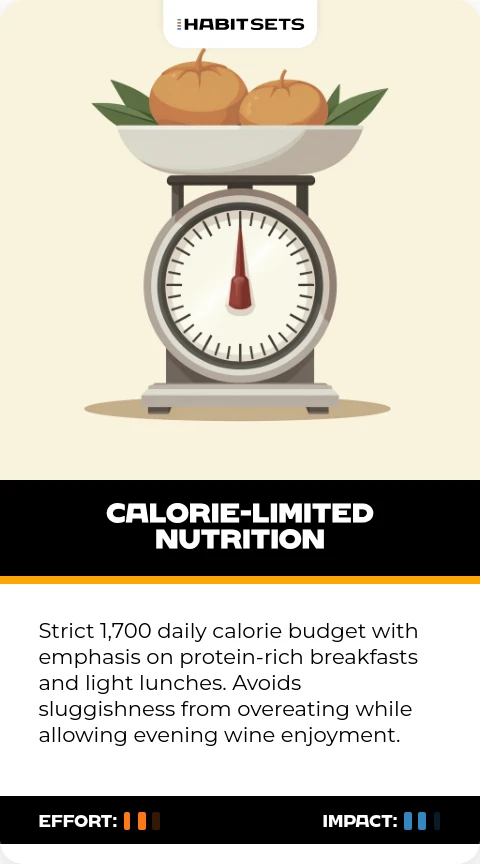 Strict 1,700 daily calorie budget with emphasis on protein-rich breakfasts and light lunches. Avoids sluggishness from overeating while allowing evening wine enjoyment.