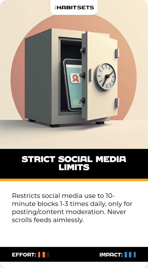 Restricts social media use to 10-minute blocks 1-3 times daily, only for posting/content moderation. Never scrolls feeds aimlessly.